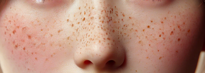 そばかすは、両頬から鼻根部にかけて、2~3mm程度の小さなシミが左右対称にドット状に点在して現れます。色は日光性のシミに比べると薄いことが特徴です。